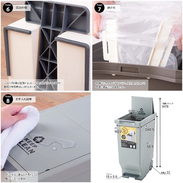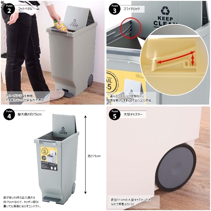 蓋はスライド式になっており、ペダルを踏めば開くので手を使わずにストレスなくゴミを捨てることができます。