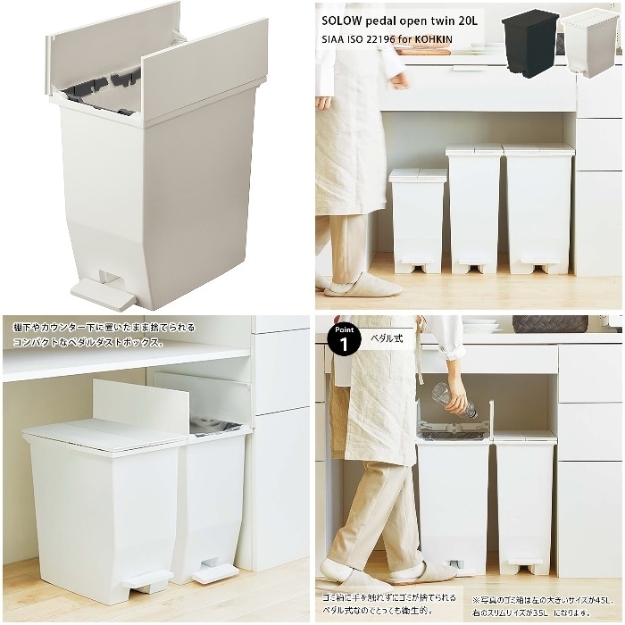 ●フタが両サイドに分割して開く観音開きタイプなので、背の低い棚下やキッチン周りにおいても快適に使えます。