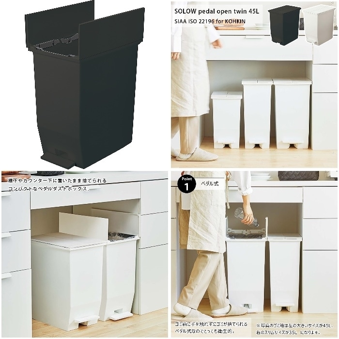 ●フタが両サイドに分割して開く観音開きタイプなので、背の低い棚下やキッチン周りにおいても快適に使えます。