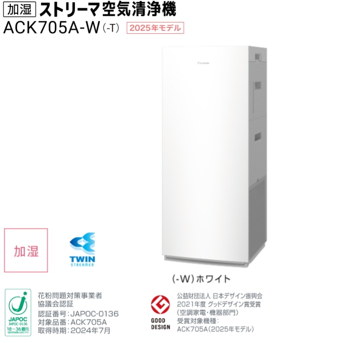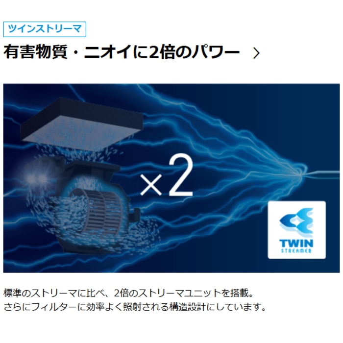 ・標準に比べ2倍のストリーマユニットを搭載し、有害物質・臭いに対応。加湿量は700mL/時、加湿機能は3段階(高め・標準・ひかえめ)の設定が可能。