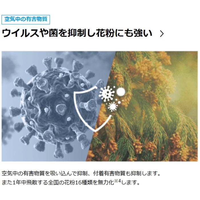 フィルター除去・抑制: ダニのフン・死骸/カビ/細菌/花粉/繊維のクズ/ペットの毛/タバコ臭/カビ臭/料理臭/生ゴミ臭/ペット臭/体臭