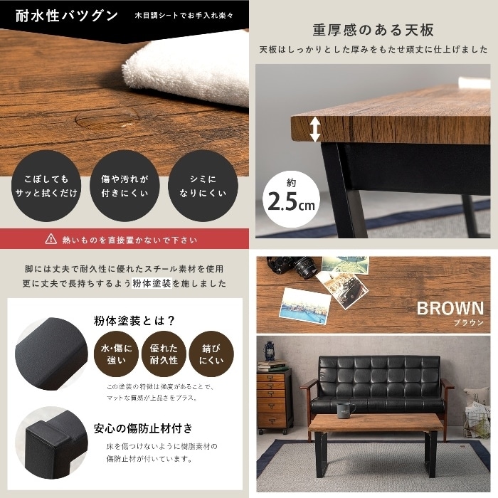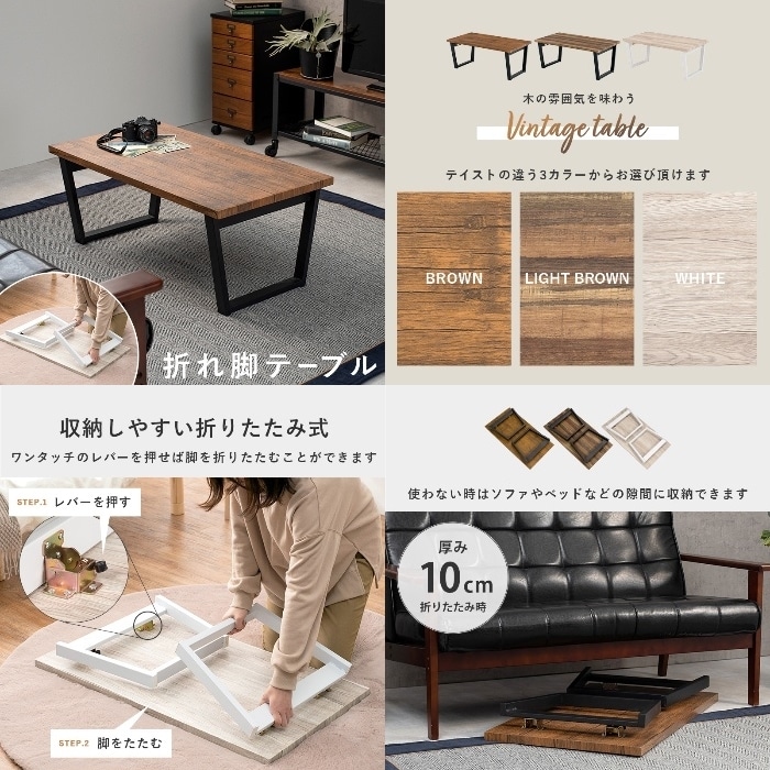 天然木の素材感を再現したセンターテーブル。隙間に収納しやすい折りたたみ式。フレーム:スチール、天板:合成樹脂化粧繊維板