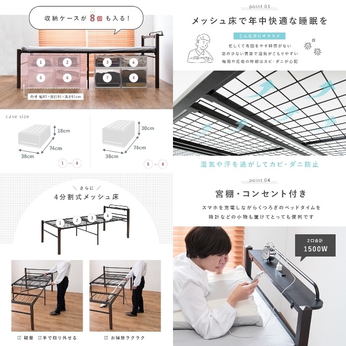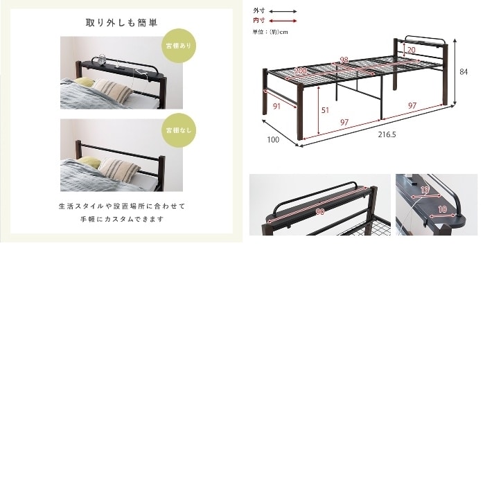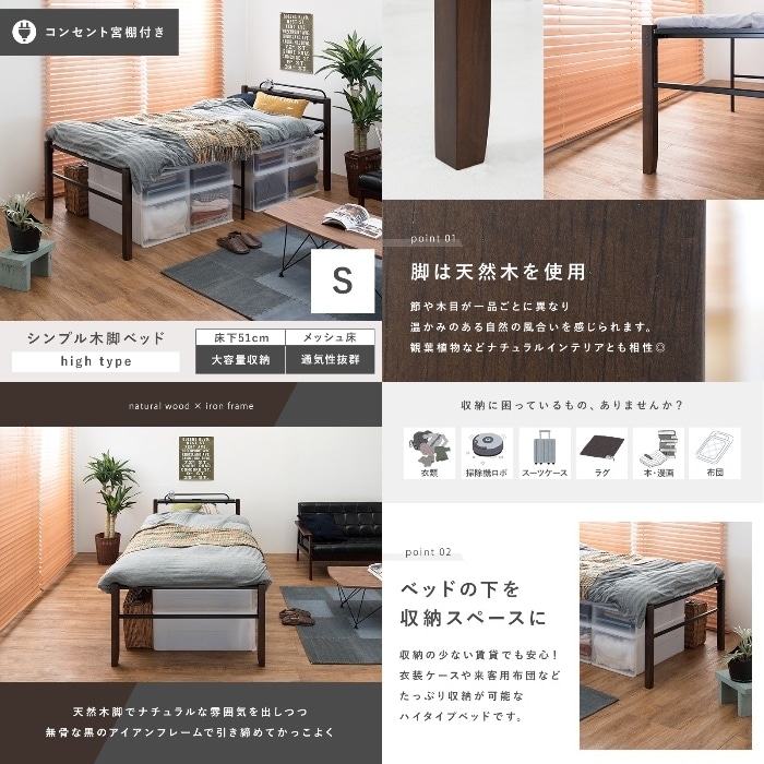 [直送5]お部屋の収納力アップ! 天然木製 コンセント付き棚板 宮付きシングルベッド ハイタイプKH-3097BK-MS 4934257279970