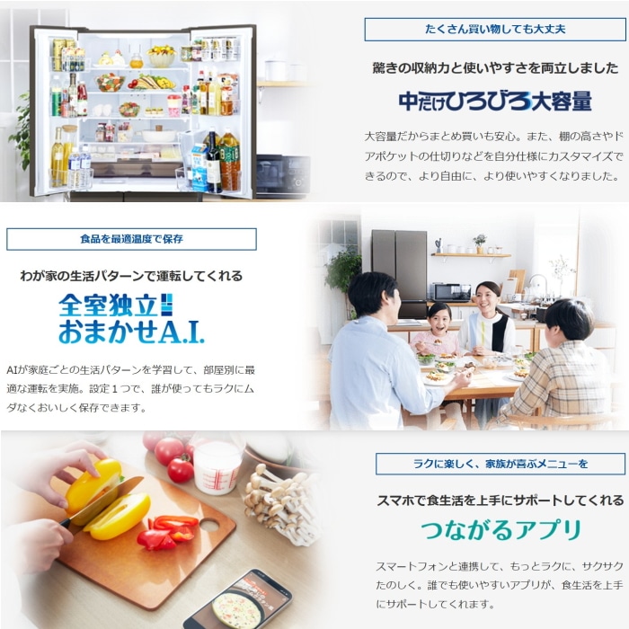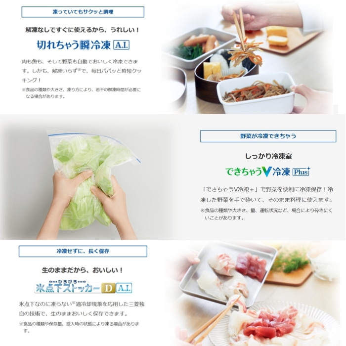 ・野菜を便利に冷凍保存する「できちゃうV冷凍」、「切れちゃう瞬冷凍A.I.」「ひろびろ氷点下ストッカーD A.I.」「真ん中朝どれ野菜室」を搭載。