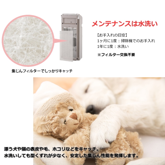 「集じんフィルター」が漂う犬や猫の表皮や毛、ホコリなどをキャッチ。水洗いしても型くずれが少なく、安定した集じん性能を発揮する。