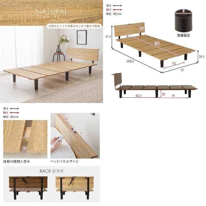 シンプルな木目のパネルに黒い脚がスタイリッシュなデザイン性の高いベッド。小さいマットレスと合わせれば、ステージベッドのような使い方も可能です。 ■組立式■2口コンセント付 (約)幅97×奥行208.5×高さ61.5×床面高24.5cm 主材:合成樹脂化粧繊維板(メラミン樹脂)