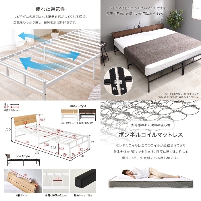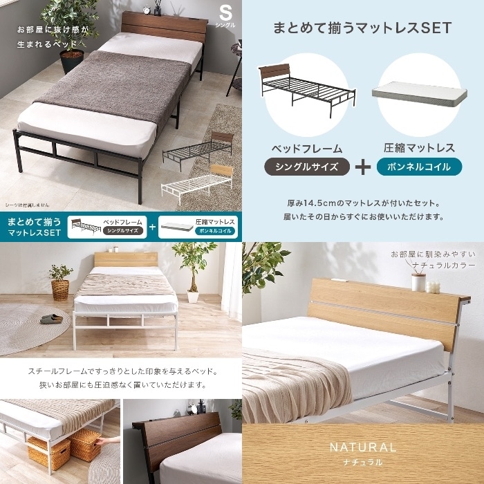 スチールフレームでスッキリとした印象のシングルベッド。ヘッドボードは木目調の傾斜があるパネル仕様です。安定感のある寝心地のボンネルコイルマットレスセット ■組立式■2口コンセント付■ボンネルコイル使用 ベッド:(約)幅98×奥行212×高さ70.5×座面高34.5cm,マットレス:(約)幅97×奥行195×高さ14.5cm ベッド:<主材>スチール・メラミン樹脂化粧繊維板、マットレス:<主材>ボンネルコイル<張地>ポリエステル