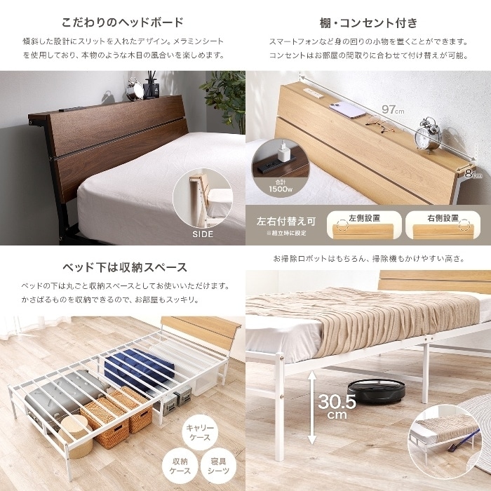 [直送5](ボンネルコイルマットレスセット) お部屋に抜け感が生まれるベッド 2口コンセント付きヘッドボード 耐荷重300kg スチールフレームベッド シングルサイズKH-3074SBR3301ダークブラウン