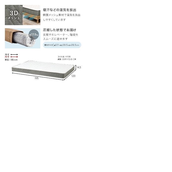スチールフレームでスッキリとした印象のセミダブルベッド。ヘッドボードは木目調の傾斜があるパネル仕様です。安定感のある寝心地のボンネルコイルマットレスセット ■組立式■2口コンセント付■ボンネルコイル使用 ベッド:(約)幅121×奥行212×高さ70.5×座面高34.5cm,マットレス:(約)幅120×奥行195×高さ14.5cm ベッド:<主材>スチール・メラミン樹脂化粧繊維板、マットレス:<主材>ボンネルコイル<張地>ポリエステル