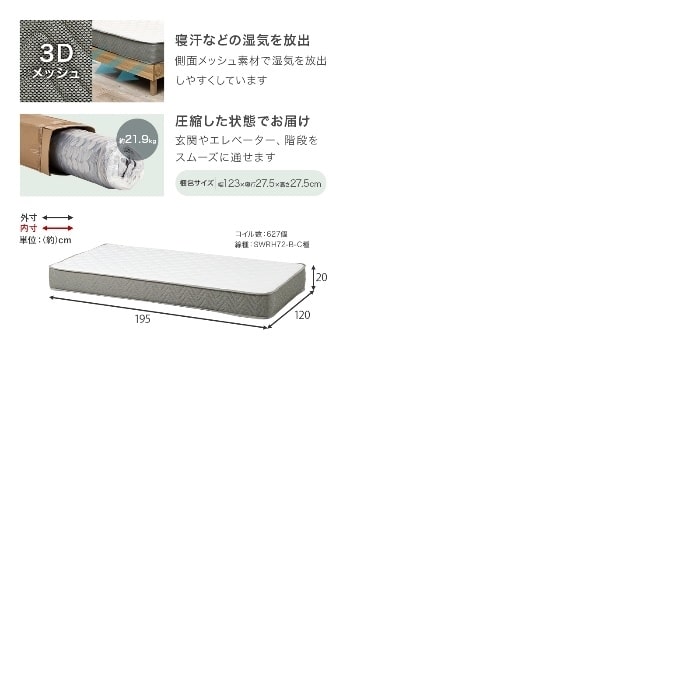 スチールフレームでスッキリとした印象のセミダブルベッド。ヘッドボードは木目調の傾斜があるパネル仕様です。体型に沿うように点で支え、体圧を分散するポケットコイルマットレスセット ■組立式■2口コンセント付■ポケットコイル使用 ベッド:(約)幅121×奥行212×高さ70.5×座面高34.5cm,マットレス:(約)幅120×奥行195×高さ20cm ベッド:<主材>スチール・メラミン樹脂化粧繊維板、マットレス:<主材>ポケットコイル<張地>ポリエステル