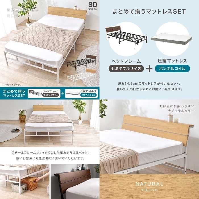 [直送5](ボンネルコイルマットレスセット) お部屋に抜け感が生まれるベッド 2口コンセント付きヘッドボード 耐荷重300kg スチールフレームベッド セミダブルサイズKH-3074SDNA3301ナチュラル4934257335195