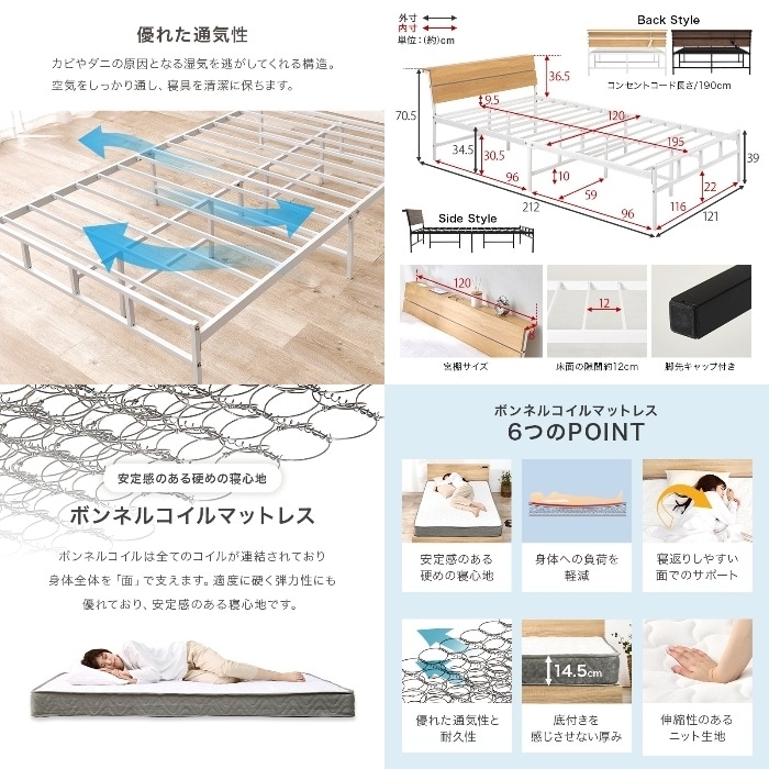 スチールフレームでスッキリとした印象のセミダブルベッド。ヘッドボードは木目調の傾斜があるパネル仕様です。安定感のある寝心地のボンネルコイルマットレスセット ■組立式■2口コンセント付■ボンネルコイル使用 ベッド:(約)幅121×奥行212×高さ70.5×座面高34.5cm,マットレス:(約)幅120×奥行195×高さ14.5cm ベッド:<主材>スチール・メラミン樹脂化粧繊維板、マットレス:<主材>ボンネルコイル<張地>ポリエステル
