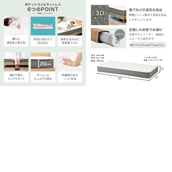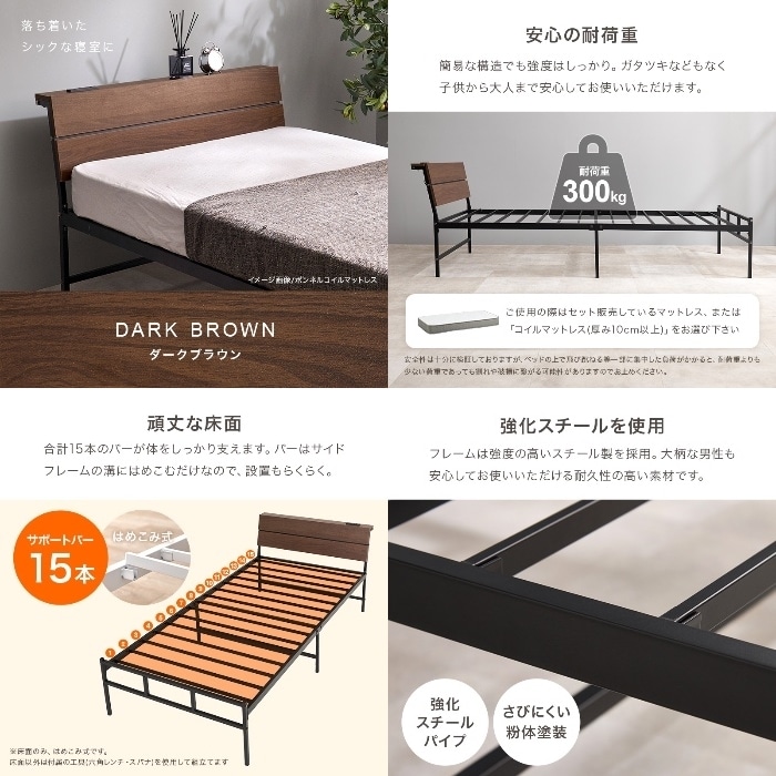 スチールフレームでスッキリとした印象のシングルベッド。ヘッドボードは木目調の傾斜があるパネル仕様です。体型に沿うように点で支え、体圧を分散するポケットコイルマットレスセット ■組立式■2口コンセント付■ポケットコイル使用 ベッド:(約)幅98×奥行212×高さ70.5×座面高34.5cm,マットレス:(約)幅97×奥行195×高さ20cm ベッド:<主材>スチール・メラミン樹脂化粧繊維板、マットレス:<主材>ポケットコイル<張地>ポリエステル