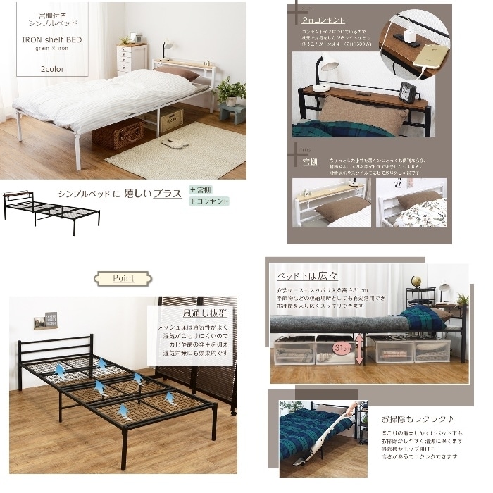 [直送5]一人暮らしにおすすめ! コンセント付き棚板 大容量収納スペース スチール製 宮付きシングルベッドKH-3085BKMSブラック4934257279512