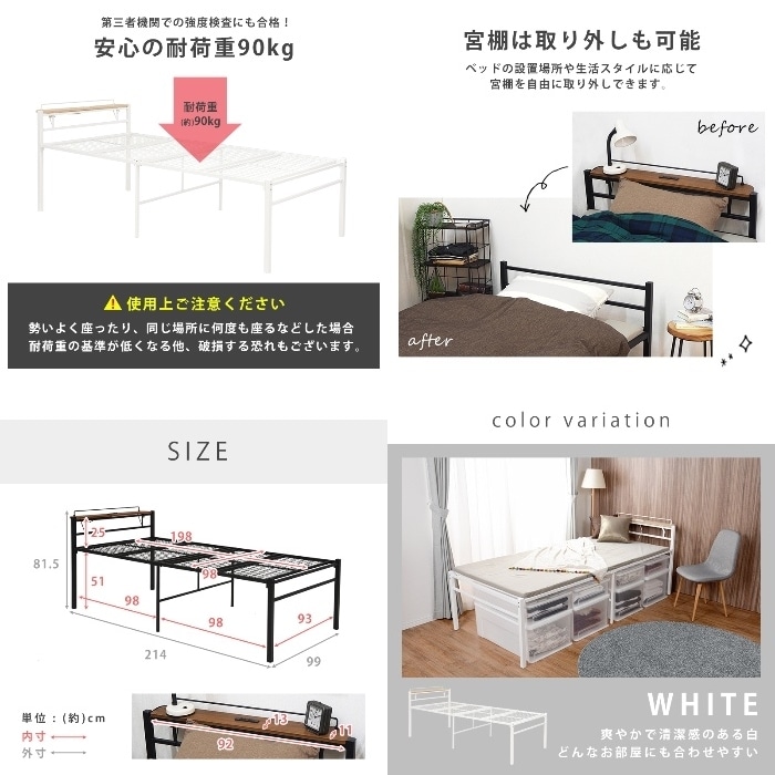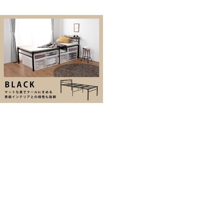 [直送5]一人暮らしにおすすめ! コンセント付き棚板 大容量収納スペース スチール製 宮付きシングルベッド ハイタイプKH-3095BKMSブラック4934257279536