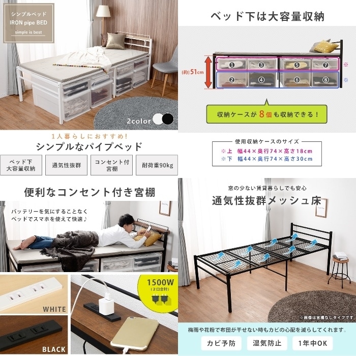 [直送5]一人暮らしにおすすめ! コンセント付き棚板 大容量収納スペース スチール製 宮付きシングルベッド ハイタイプKH-3095WHMSホワイト4934257279543