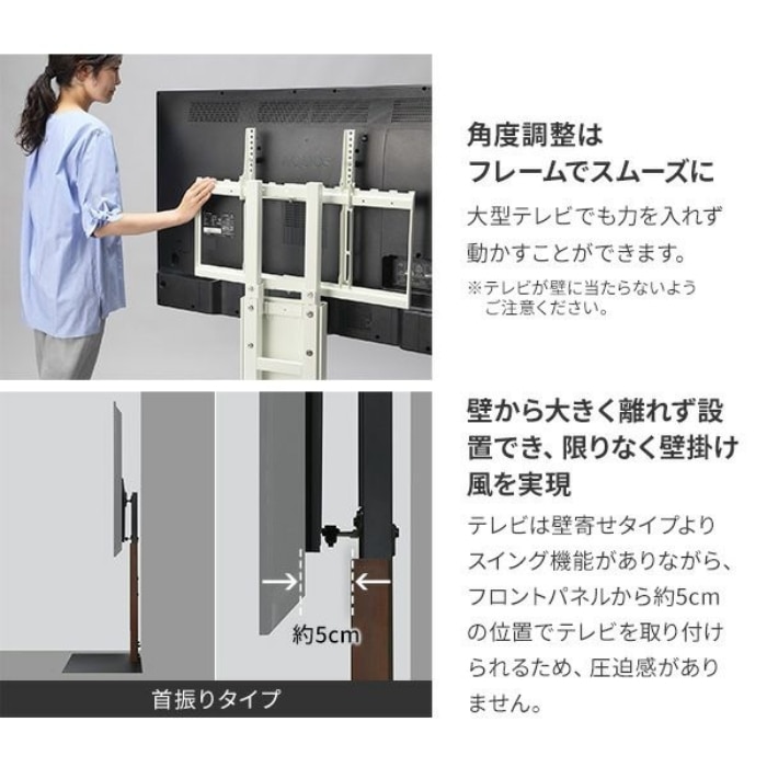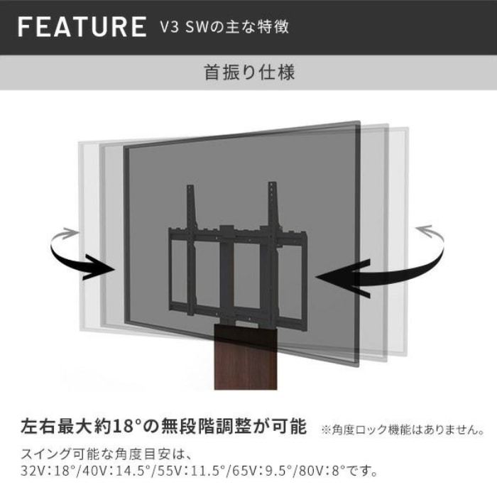 ハイスペックで人気「WALL V3」の良さはそのままに、さらに左右の首振り機能を搭載した「V3 SW」。 テレビの向きを最適な角度に調整できるため、テレビを見る位置に合わせたり、窓からの反射を避けて視聴することが可能。 V3同様、特許を取得した3Dベースが段差を感じさせないため、小さなお子様やご年配の方、車椅子をご利用の方の家にも安心して設置できる作りです。